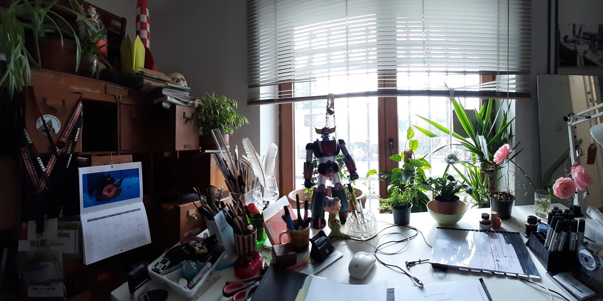 Sandro studied painting in Antwerp and comic strips in Ghent before moving to Rochefort with his wife Kanako. His first comic strip, "L'Autre Côté", was published in 2013 by "Le Moule-à-gaufres", but he was never paid for it. We met in 2016 during a workshop organised at the Belgian Comic Strip Centre. We were queuing in front of the Casterman stand and by the time we reached the publisher, he had convinced me to work with him on his new project, "Het Bezoek", which we pitched together to Reynold Leclercq.